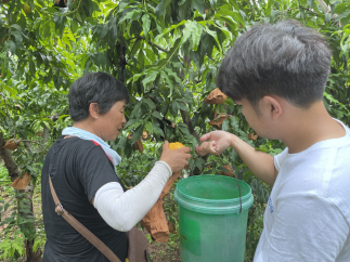 正值桃子成熟之际,实践团深入田间地头,学习农事知识,参与农事实践。我们来到村民刘姐家的桃园,协助进行桃子的采摘、包装、运输、邮寄等一系列工作,并在刘姐的带领下参观了解桃子的长势情况,系统学习了蜜桃从历史到现代的发展历程、从品形到种类的基础知识、从种植到收获的细节要求。